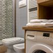 The refined and functional bathroom features a large sink with a full-length mirror, a spacious shower, a toilet, and a bidet, as well as a laundry area with a washing machine and a towel closet.